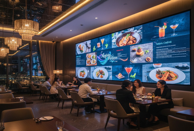 Màn hình LED nhà hàng không chỉ mang lại giá trị thẩm mỹ mà còn là kênh truyền thông trực quan có khả năng sinh lợi.