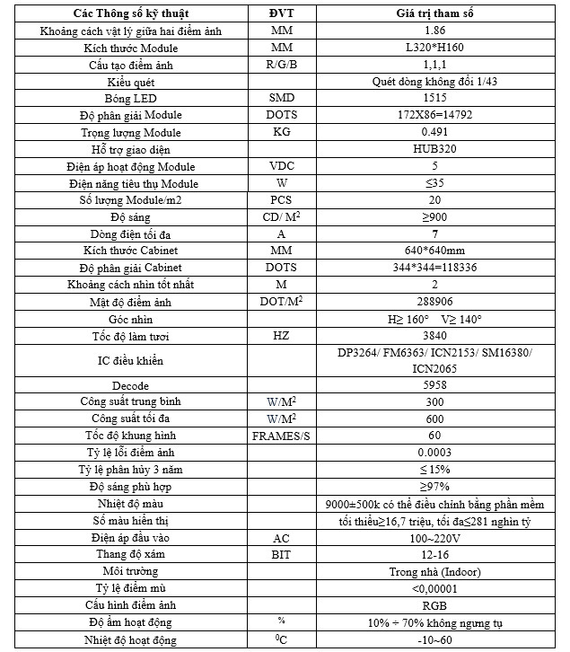 THÔNG SỐ MODULE LED P1.86 TRONG NHÀ